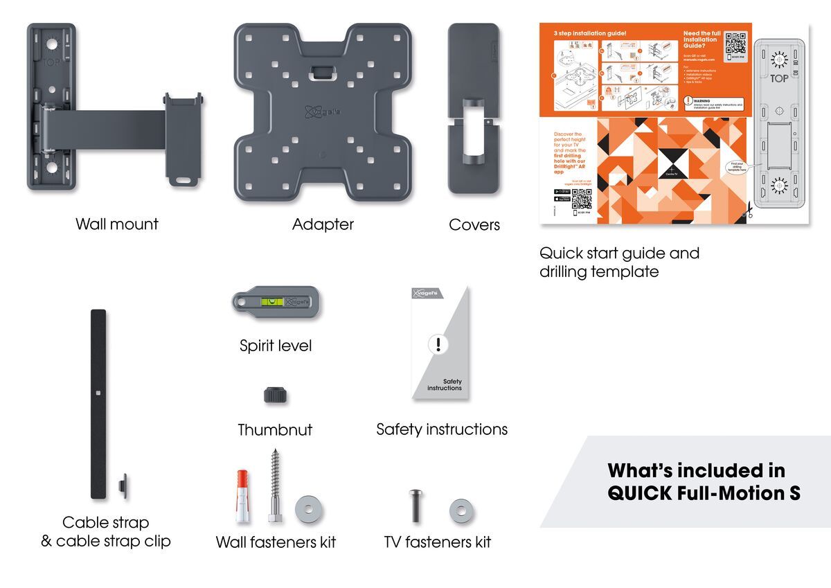 The QUICK Full-Motion TV wall mount includes mounting materials. A drilling template, screws and Fischer® DuoPower plugs are included in the packaging as standard. As is a spirit level and a cable tie to bind cables tightly and securely together. The Quick Installation Guide explains step by step how to install everything safely. You can also view the detailed manual or the installation video. You can find these online. To mark out the first drill hole, you can use our free DrillRight app.