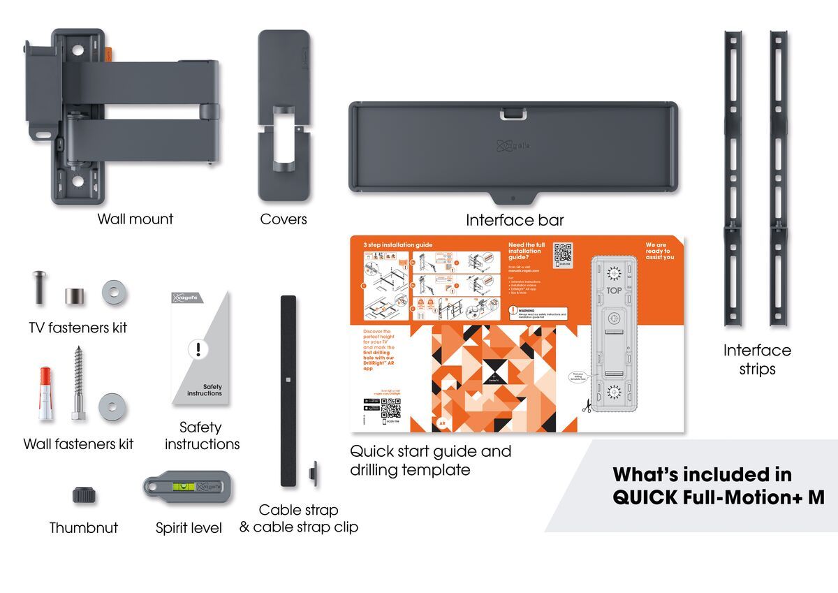 Of course, you need screws and plugs to mount your TV. Vogel's has taken care of that for you. All the necessary mounting materials are included in the packaging: screws and Fischer® DuoPower plugs, as well as a drilling template, a spirit level and cable ties. Mark out your first drill hole easily, using the free DrillRight app. The Quick Installation Guide shows you step by step how to install everything. A detailed manual and an installation video are also available. You can find these online.